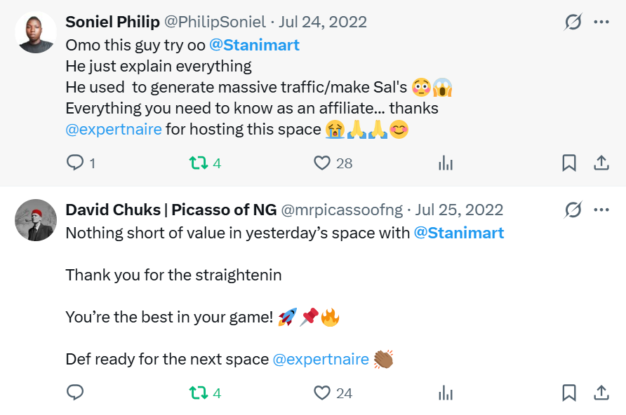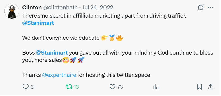 I once had a Twitter (X) session with Affiliate marketers where I shared free knowledge on Affiliate marketing. Both newbies and pros confirmed my internet-know-how.