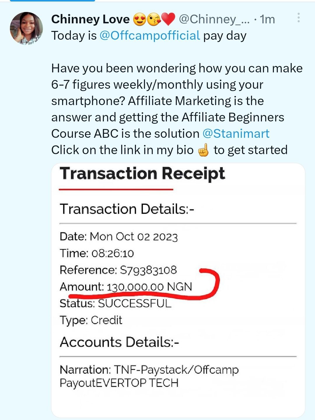 Or should we talk about Charity, who has made over 500k and even gotten for herself a new Laptop? Note: She sells with different Affiliate marketing platforms.